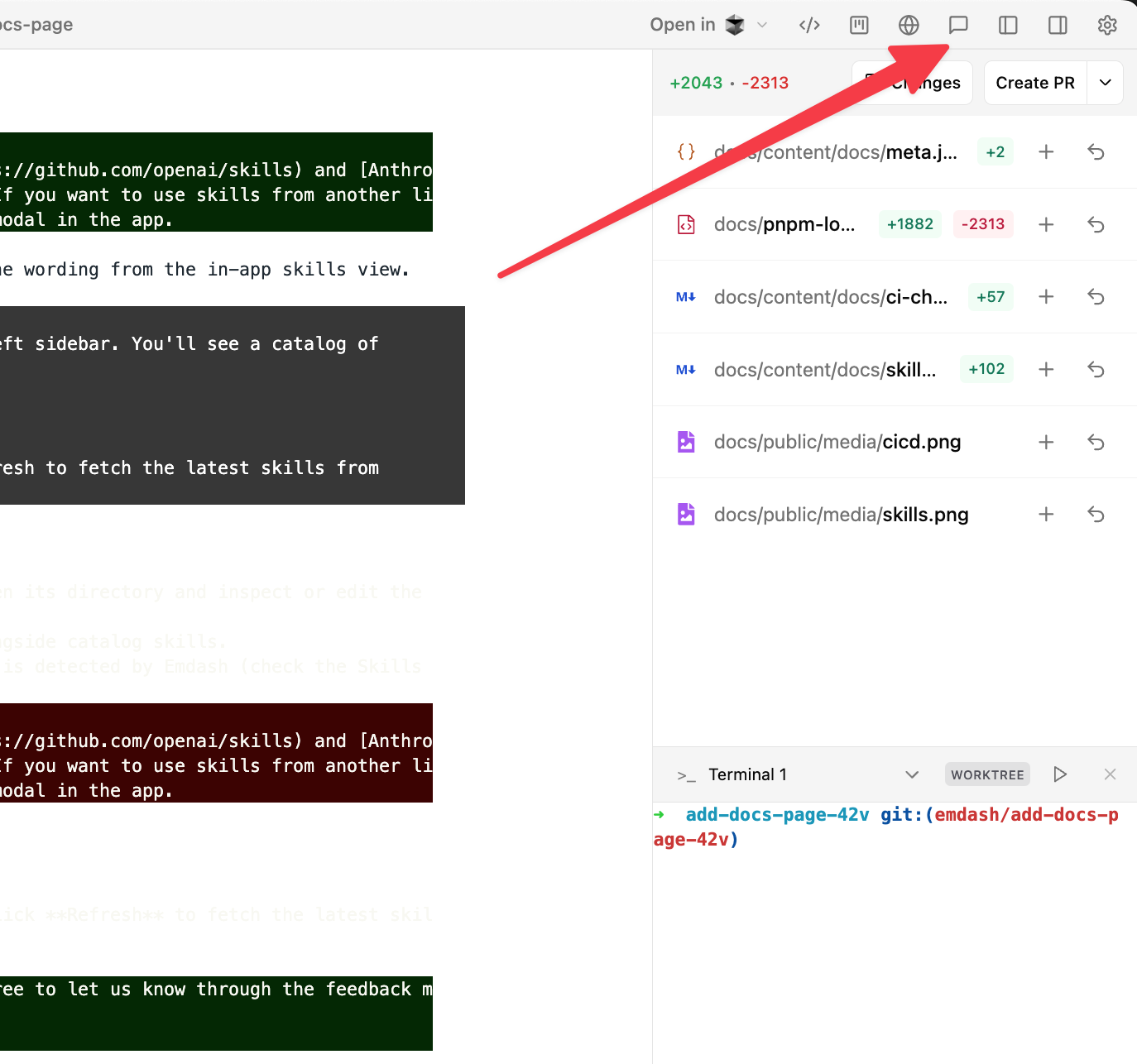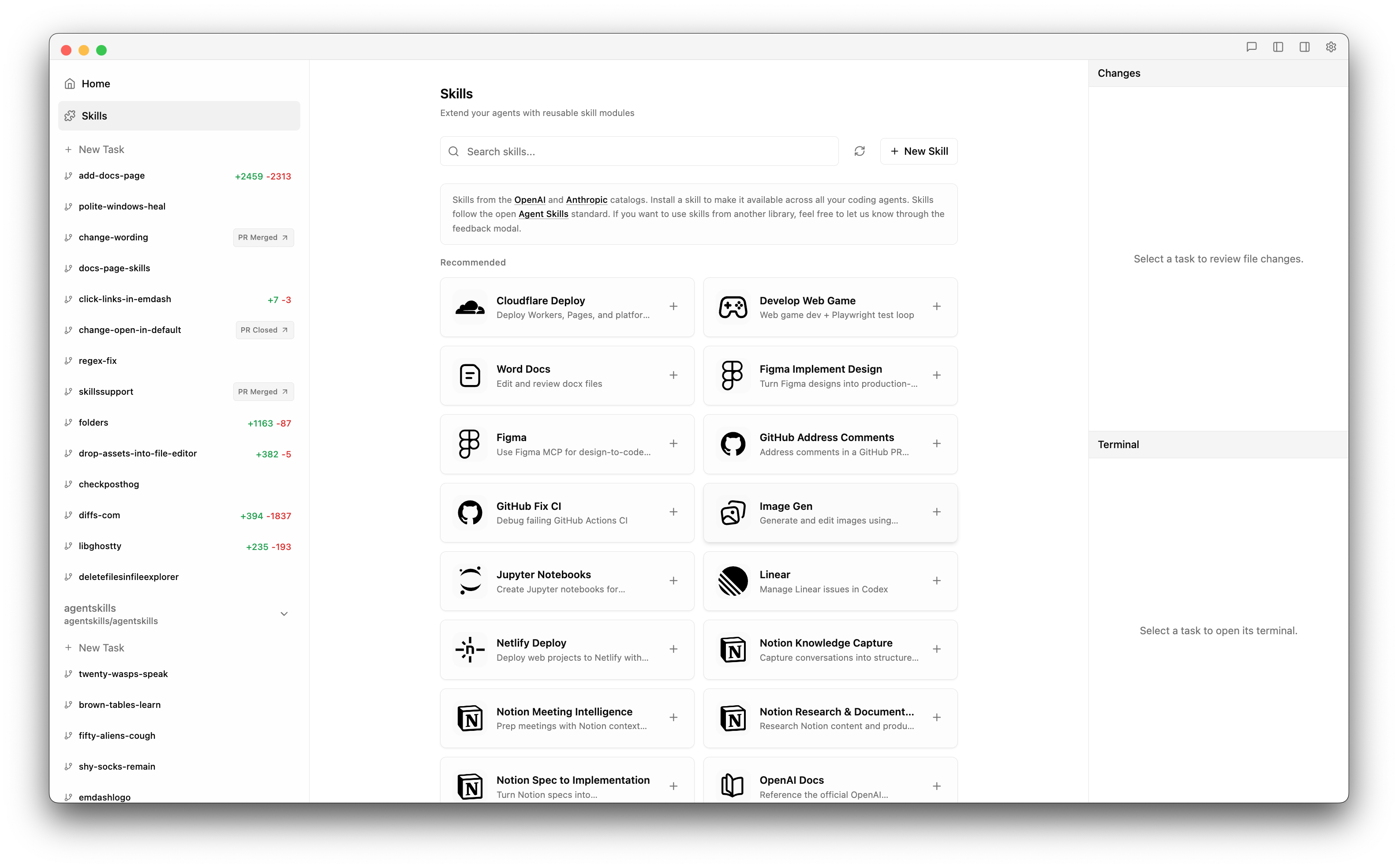 - Click the terminal icon on an installed skill to open its directory and inspect or edit the